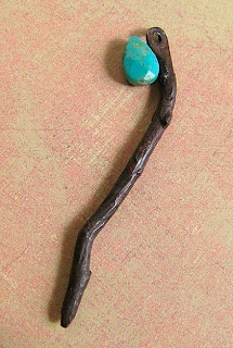 I have wanted to create a branch finding to pair with a special strand of Narcozari turquoise briolettes I have had for-ev-er. My plan was to patina the branches with a new burgundy/brown color but I don't know?